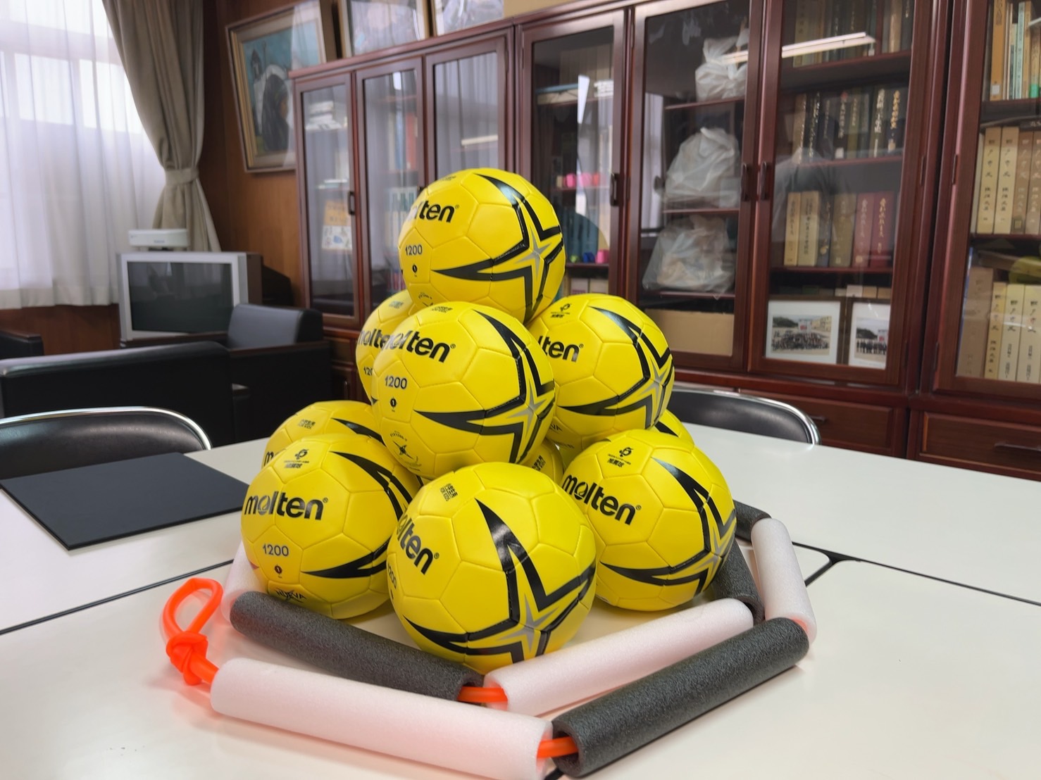 今回の贈呈品は、ハンドボール20個、グリップテープ22個、