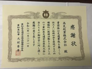 高見起業は優良交通安全団体として感謝状をいただきました。